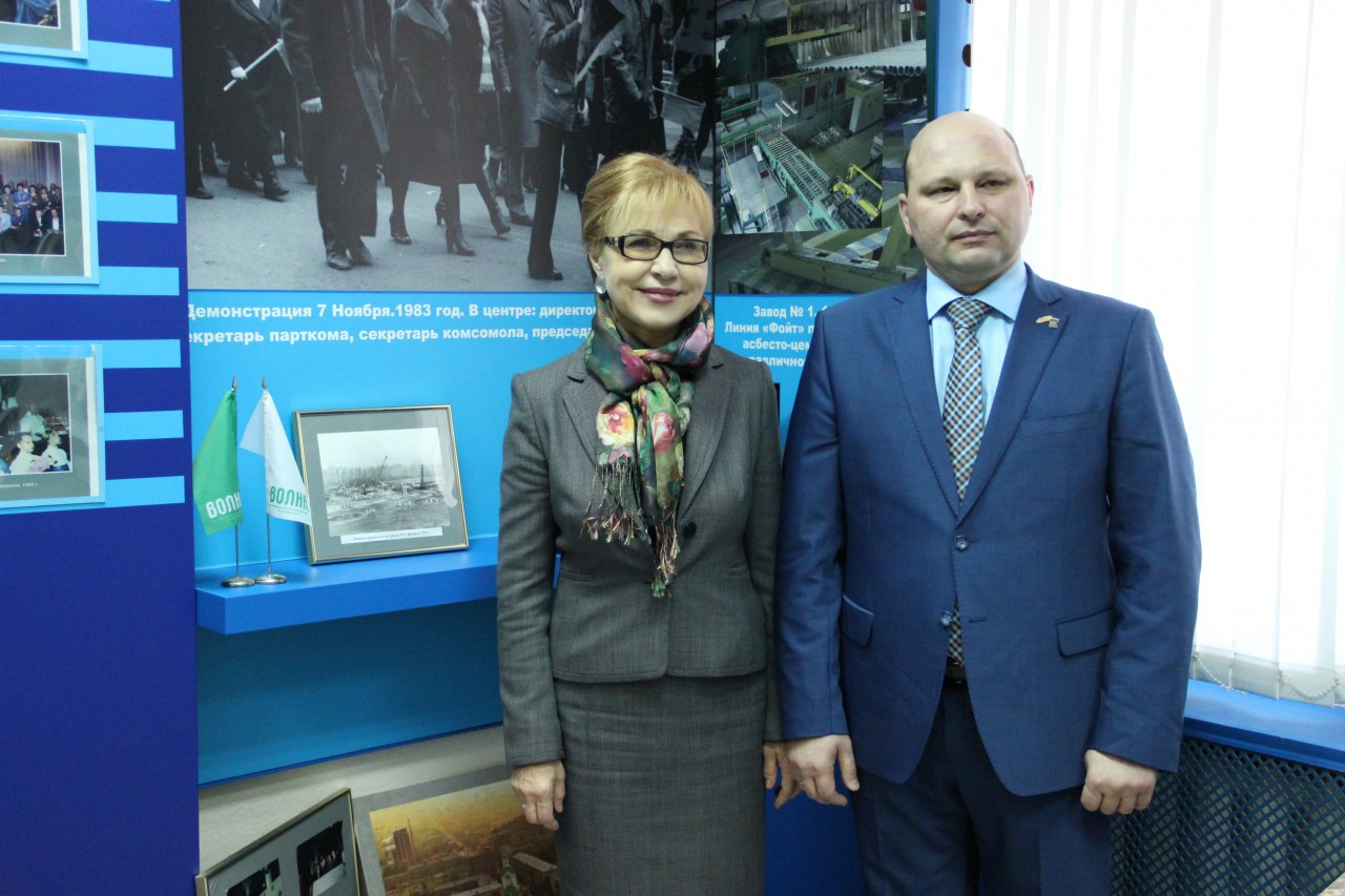 Первым почетная гостья посетила цех, куда была перенесена, и в апреле этого года запущена в работу, модернизированная линия по производству волнистых хризотилцементных листов. Ознакомилась с работой линий по производству плоских листов, труб и муфт различного диаметра, а также технологических линий по нанесению защитно-декоративных покрытий на фасадные материалы - Виколор и Красстоун , осмотрела автоматизированную упаковочную линию.